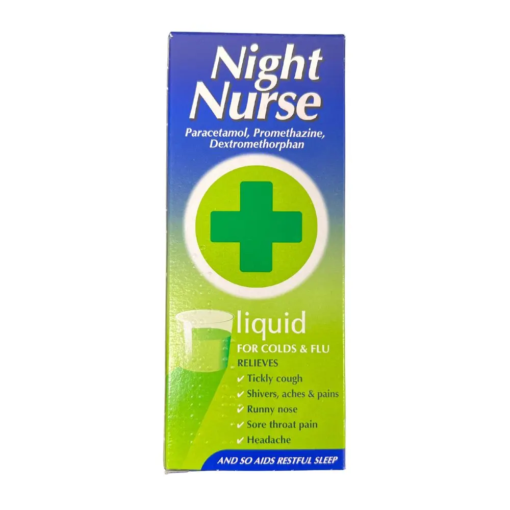 Night Nurse Liquid is used for the short-term relief of night-time cold and flu symptoms, including cough, runny or blocked nose, headache, fever, and aches and pains.