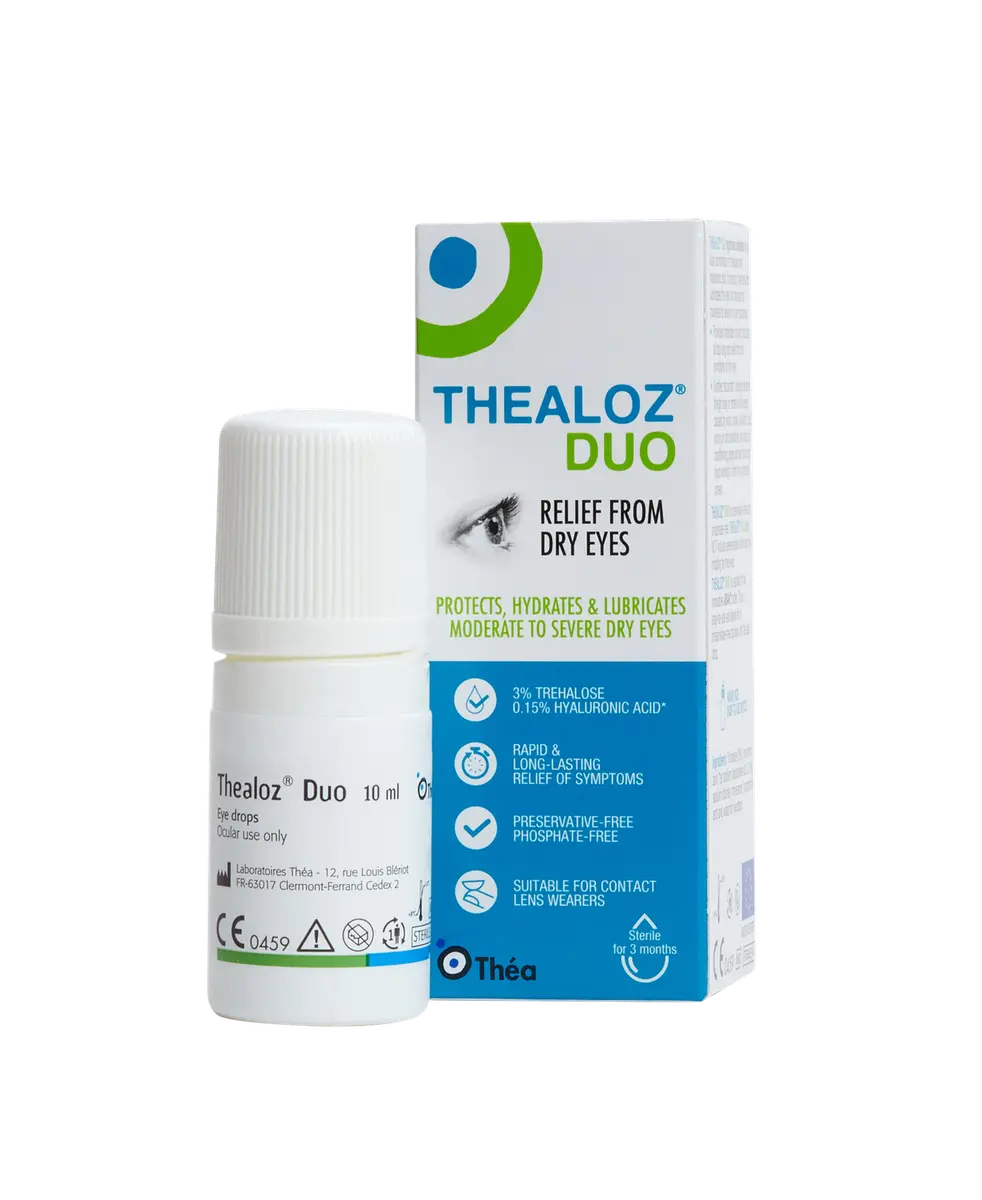 Thealoz Duo contains trehalose and sodium hyaluronate, two ingredients that work together to protect and hydrate the surface of the eye.
